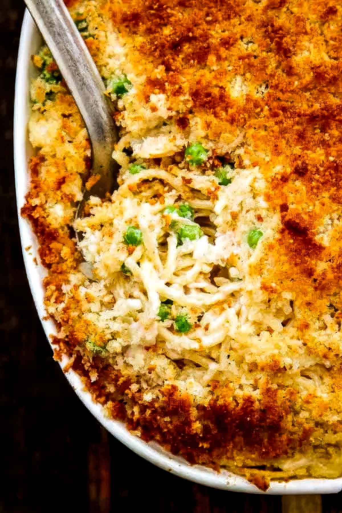 A creamy Turkey Tetrazzini recipe with mushrooms, peas, and a crunchy topping made with panko breadcrumbs and parmesan cheese. So good you'll be roasting two turkeys!
